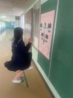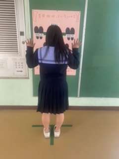 養護教諭の先生が、本館2階の渡り廊下に『背骨曲がっていないかな?』という自己検診の張り紙をしてくれています。