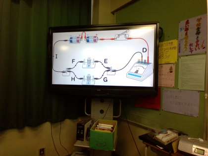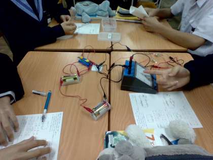 回路に流れる電流の実験をんグループに分かれて行いました。どのように回路を作ると電流が流れるか、豆電球に流れ込む電流と流れ出る電流の大きさを比べたり、グループで考え試行錯誤していました。