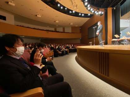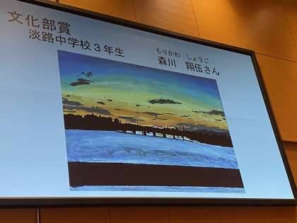 1月22日に大阪経済大学フレアホールにて、東淀川区青少年指導員連絡協議会主催による第15回東淀川区音楽フェスティバルの開始に先立って、第19回絵画・写真コンクール表彰式が行われました。多数の応募作品の中から、本校3年生の森川翔伍君の作品が見事『文化部』賞を受賞しました。