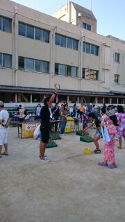 地域の方々による手作りのお祭りです。かき氷や冷やしたスイカ、わらびもちなどの食べ物とともに、輪投げやダーツ、スーパーボールすくいなどの屋台が校庭にずらっと並びます。子どもたちは各屋台を順にめぐりながら、ゲームに興じていました。淡路中学生も屋台のお手伝いに参加し、お祭りを盛り上げていました。