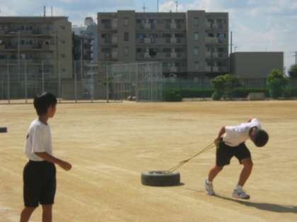 『走る』が基本の陸上部。同じような練習ばかりではモチベーションも上がりにくいので、別メニューの練習を行っています。ハードル越えや腹筋、縄跳び・タイヤ引きなど運動場のあちこちで順番にトレーニングをこなしていきます。