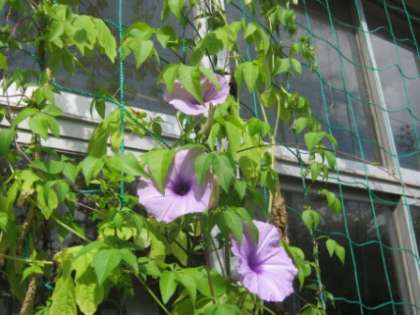 東校舎の壁面に植えられた「緑のカーテン」で、薄紫色の花が咲き誇っています。