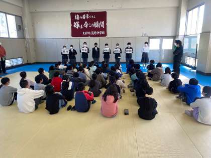 小中一貫校須賀の森学園になってから7年ですが、淡路中学校はそれよりずっと以前からピアサポートに取り組み、1年生がリトルティーチャーとなり校区の小学校5年生を教える取り組みをしてきました。