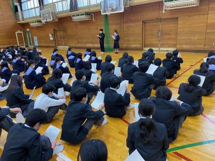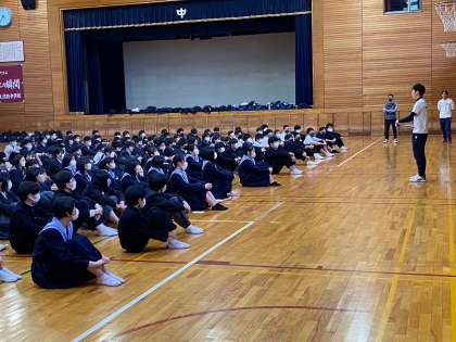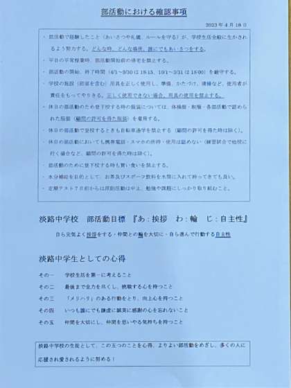 昨日の放課後に、本年度の部活動編成会議が各部活動毎に行われ、その後体育館で新1年生が参加する中、2023年度の部活動集会が開かれました。部活動担当の先生方からの部活動の意義等が話された後、部長代表から部活動における確認事項が読み上げられ、入部者全員で確認されました。