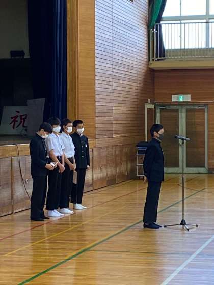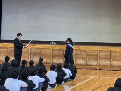 いじめを考える時間の後、引き続き全校集会が行われ、女子バレーボール部の表彰状の伝達式が行われました。