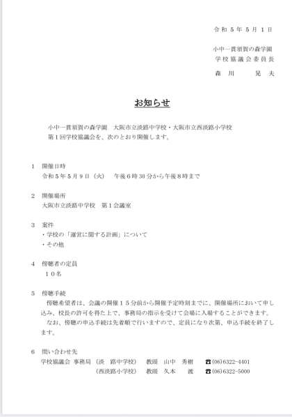 5月9日の18時30分より、令和5年度第1回小中須賀の森学園学校協議会を開催しました。