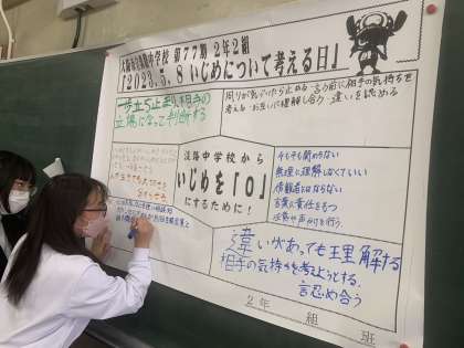 2年生では、学年集会に引き続いて1時間目の道徳で真剣に話し合いがおこなわれました。