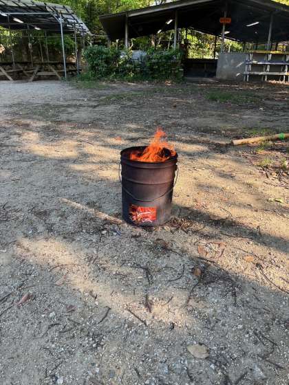 火おこしは2組が早く火を起こす事ができました。これから2組は1組の火おこしに協力します。