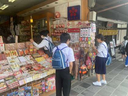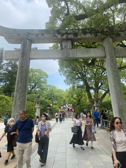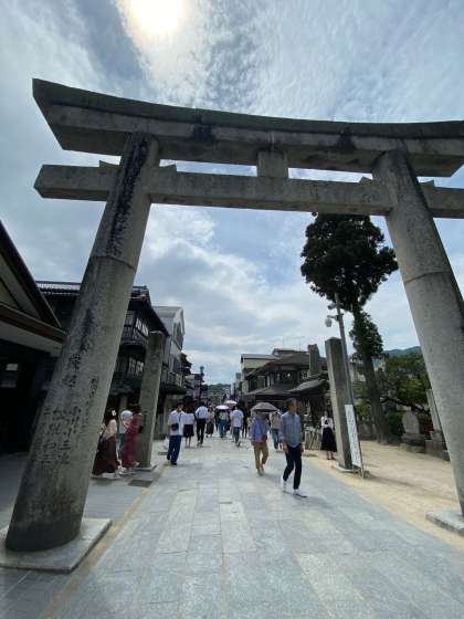 境内を散策したら、眼鏡橋を渡って参道へ、メイン通りでお土産購入と食べ歩きで楽しい一時を過ごしました。
