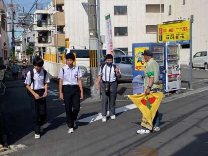 奇数月には、教職員も普段の登校指導を学校周辺から校区全体に広げて、地域の方々と登校見守り指導を行っています。