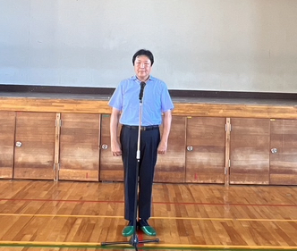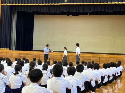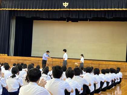 校長先生より、残暑が厳しいのでクーラーを例年より長い期間、学校でも家でも使用することになり、夏風邪を引かないよう体調管理に気をつけてほしい、また、9月末に文化祭があるので、いい思い出が作れるように頑張っていってほしい。