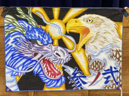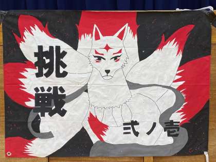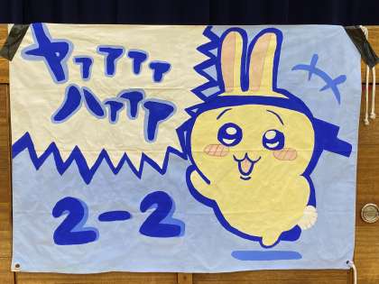 体育大会は赤団と青団に分かれて縦割りで争うプログラムもあり、各クラス応援旗も赤団のクラスは赤色をベースに、青団のクラスは青色をベースに描かれました。