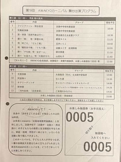 新型コロナウィルス禍により、休止を余儀なくされてきた地域の一大イベント『AWAKYO カーニバル』が去る11月12日に3年ぶりに淡路中学校で再開催されました。