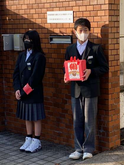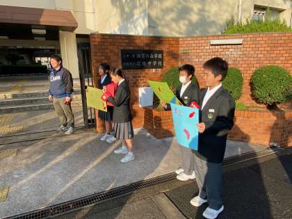 今週月曜日の全校集会での生徒会からの告知どおり、火曜日からの3日間、朝のおはよう運動と兼ねて、淡路中学校は赤い羽根募金運動に参加し、生徒会が募金活動を行っています。
