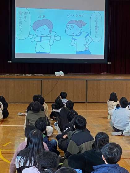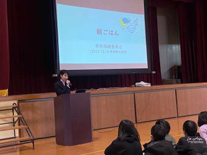 児童・生徒のパワーポイントでのプレゼンの後、西淡路小学校の栄養教諭の服部先生から『朝ごはんの大切さについて』お話をして頂きました。