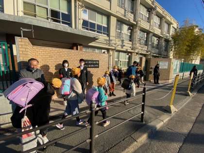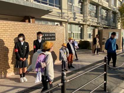 西淡路小学校の児童が淡路中学校の正門へ、淡路中学校の生徒会が西淡路小学校の正門へそれぞれ出向き、両校のおはよう運動に参加します。