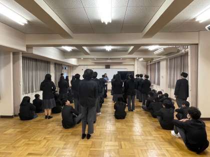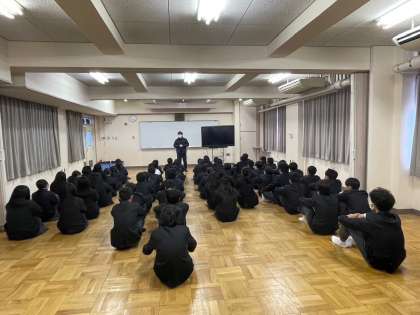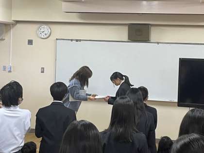 25日(木)の集会は大森先生の話と学年で取り組んでいる英単語100問テストの表彰がありました。