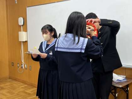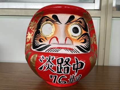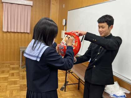 木曜日の学年集会で3学年では、学年主任が用意したダルマに学業成就を祈念して、学級代表が目入れをしました。