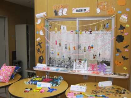 家庭科では3年生が手芸にチャレンジ。フエルトを使って、幼児のおもちゃを製作しました。2年生は、各家庭の自慢料理を写真で紹介。オリジナルレシピも添えられており、気に入った料理はすぐに試作できそうです。家庭科部によるハロウィンの飾りつけもステキでした!