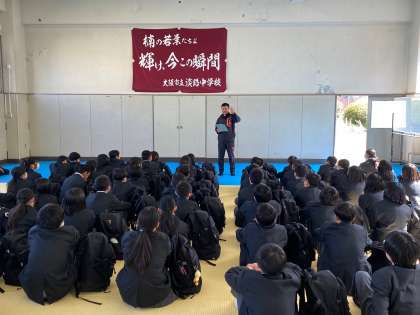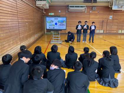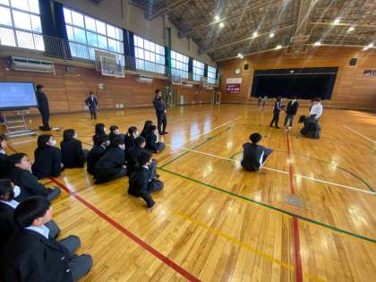 格技室で人権教育担当主担の安田先生から、サークル活動の歴史と意義について説明があり、その後、各サークルの活動場所をクラス毎に訪問見学しました。