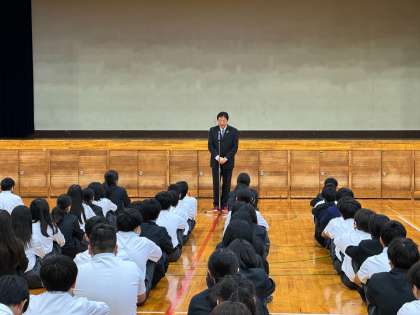 まず、生徒会長より先日行われた「いじめについて考える日」について感じたことが語られました。淡路中学校では、いじめや差別は絶対に「しない」「させない」「許さない」という姿勢をみんなで守っていきましょう!と呼びかけました。