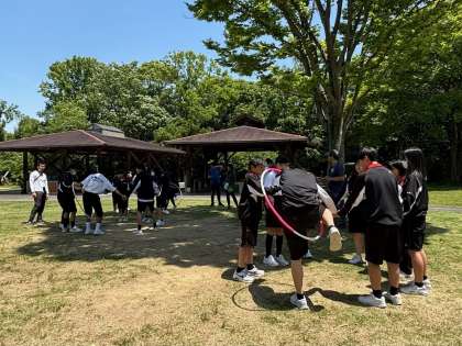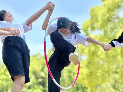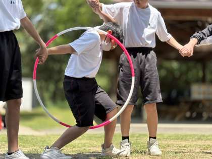 各クラスグループ毎に分かれて、フラループを使ってのループリレーゲームです。