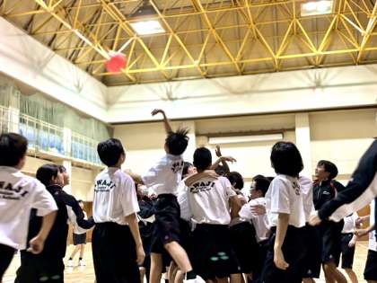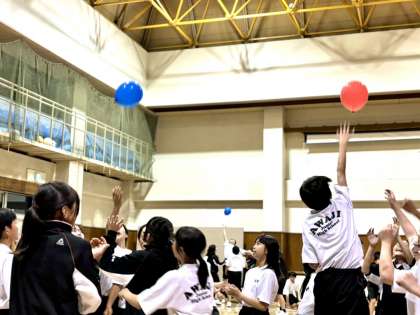 夜レクのプログラム1、学級対抗腕立て大会から始まりプログラム2、風船バレー大会へと続きます。