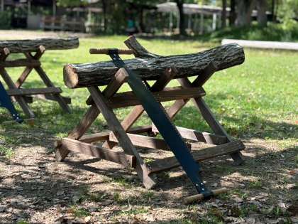先ずは、二人一組でノコギリを使って、まき割ができる長さにカット!