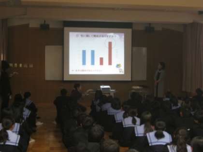 講師の先生には、ビデオやパソコンを使ってわかりやすくお話いただき、ありがとうございました。各クラスの保健委員さんも事前のアンケートを上手くまとめて発表できていましたよ!
