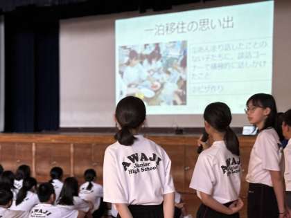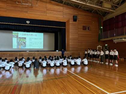 13日木曜日5限目、3学年は修学旅行、2学年が校外学習に出かけている中、1学年は体育館『一泊移住振り返り』を行いました。