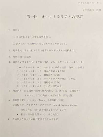 木曜日の3時間目に、2年生が英語の授業で、オーストラリアのタスマニアの学校に通う高校生とオンライン交流を行いました。