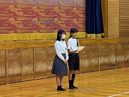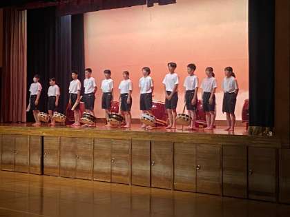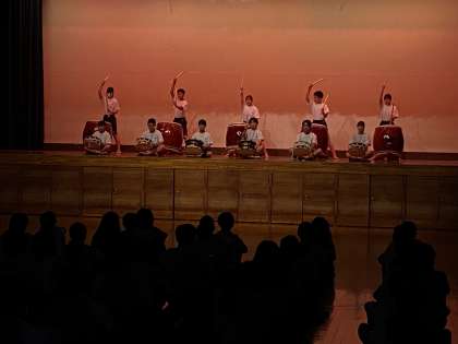 生徒会長の開会宣言の後、舞台の緞帳が上がり、オープニングアクトは部落問題研究会による太鼓演奏です。