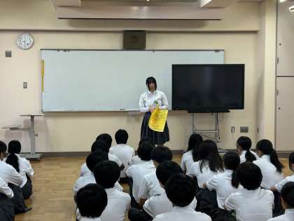 先週の3学年の学年集会では、学級代表より今月の学年目標の発表と菅先生より進路選択に向けてのお話がありました。