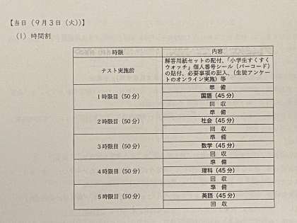 テストは国語・社会・数学・理科・英語の5教科です。