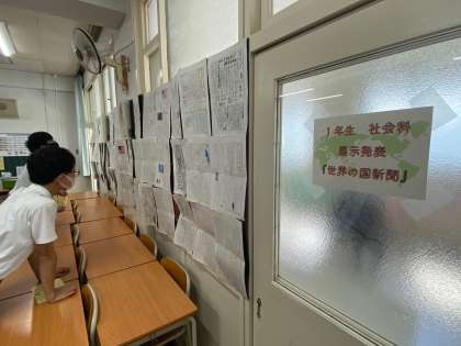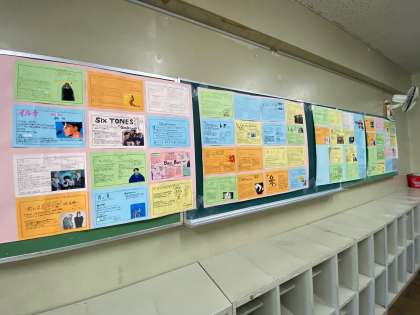 新東館3階は第1学年のフロアです。国語科、理科、社会科、英語科、音楽科、技術科の6教科からの作品が展示されました。
