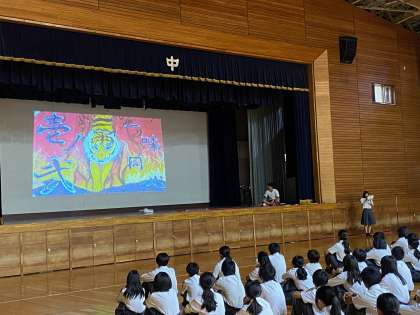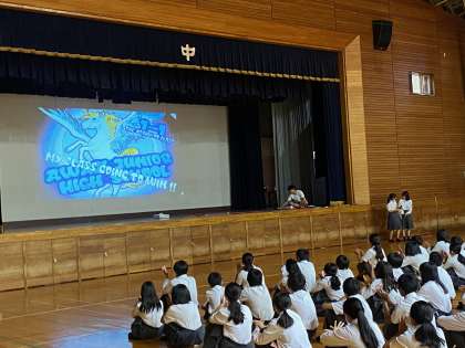 表彰状の伝達式に続いて行われた学級コンテストでは、1年1組から3年2組まで代表者がそれぞれの学級旗デザインの特徴や意味を説明しました。