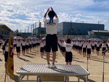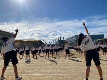 体育委員長から選手宣誓、競技上の諸注意の後、午前の部プログラムの1番は全校生徒によるラジオ体操です。
