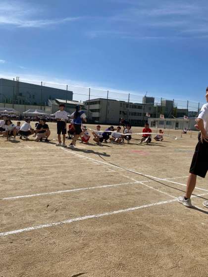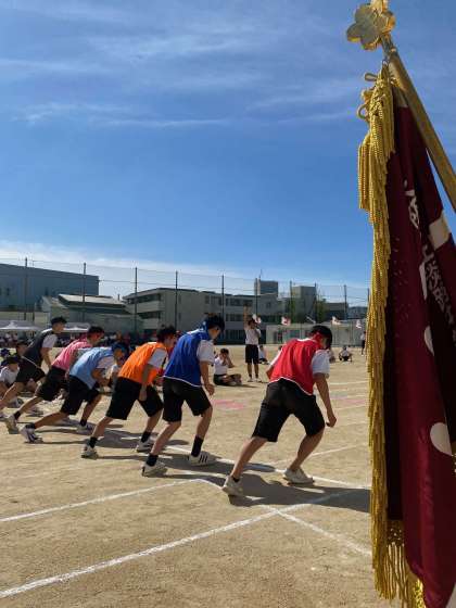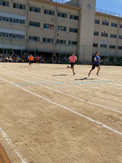 午前の部、徒競走の最後は中距離走、徒競走の中でもペース配分が難しく、一番キツイ競技ですが、赤団・青団の熱い声援に押されて、みんな最後まで全力で走り切りました。