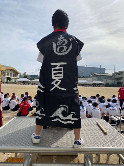 2年生は、演舞の練習は体育の時間を中心に練習、それと並行して美術の時間や総合の時間、放課後に自らの衣装の法被をデザインし作って来ました。