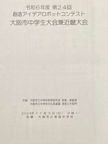 去る11月3日に、柴島中学校を会場に第24回創造アイディアロボットコンテスト大阪市中学生大会兼近畿大会が開催され、他府県私立中学校5校も交え全23校が、応用部門12チーム、基礎部門45チーム、制御部門13チーム、ライントレース部門9チーム、相撲部門5チームにそれぞれ分かれて、日頃の練習とロボット操作技術、ロボットの機能技術や完成度を競い合いました。