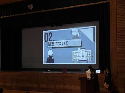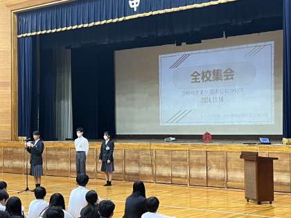 今回は、後期生徒会にバトンタッチ後となりますが、前期生徒会の公約であった、通学靴の見直しと女子の頭髪について、校則改訂の経過説明が行われました。