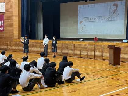 前期生徒会を慰労するなか、校則の改訂については昨年度の生徒会より男子の頭髪をはじめ靴下や下着の色などを議論し、生徒会として豊かな学校生活を築くために長い時間かけて議論し正式な手続きを踏みながら改訂し、そしてなにより自分たちで決めたルールは自分たちで守る事で、先生方の信頼を得てきました。