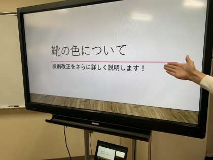 また、前期生徒会からは昨日の全校集会で報告があった「靴と髪型のきまりの見直し」について、詳しい説明がありました。