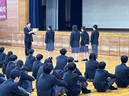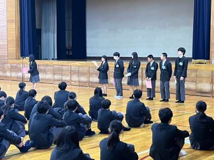 続いて生徒専門委員会の代表者と生徒会執行部の代表者から、先日の生徒専門委員会・生徒議会を経て決めたそれぞれ月間目標の発表がありました。