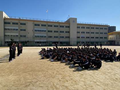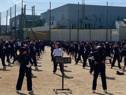 当日は、雲一つ無い快晴に恵まれ、トラック一周をクラス毎にアップ後、準備運動のラジオ体操で始まりました。