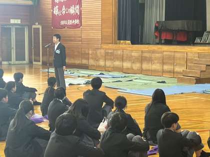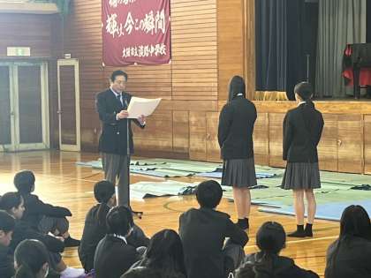 はじめに生徒会執行部の代表者から今週の公立一般選抜、卒業式についての説明があり、3年生のために素晴らしい卒業式をしましょうと、全校生徒へ呼びかけがありました。