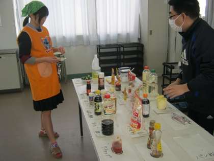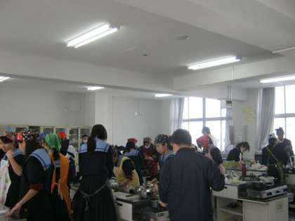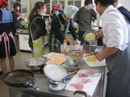 中学校での調理実習も今回がラスト。3年間の総まとめとなる調理実習です。事前の学習で各班それぞれがオリジナルメニューを相談し、作業手順や役割分担を考えました。本番ではみんな和やかにわいわい言いながら楽しく調理に取り組みました。
