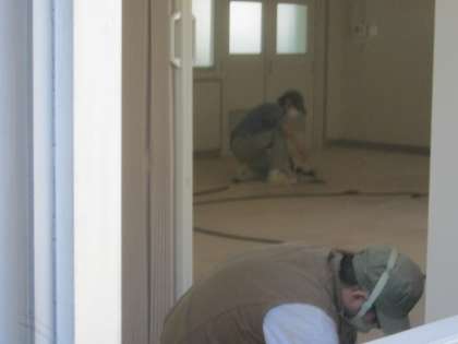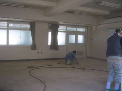 PTAの会議や入学説明会・修学旅行説明会など、多くの保護者の皆さまに利用していただいている第1会議室。床の傷みが目立ってきたため、研磨作業をお願いしました。大型の研磨機を使って、ていねいに磨き上げてくださっています。