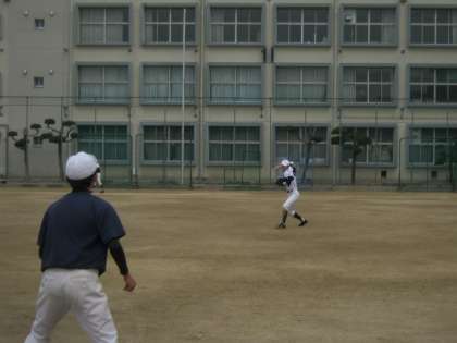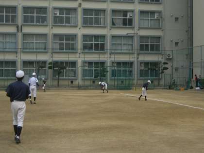野球部では、中継プレーの練習中。3人でボールを次々に中継していきます。いかに素早くボールをつなげるかがポイントですが、あせったり急ぎすぎると上手くボールをキャッチできません。
