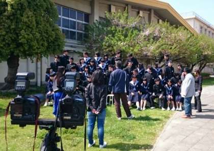 中庭の芝生広場で写真撮影です。満開だったサクラの花も、すっかりと姿を変えて、若い緑の葉がひらいています。天候にも恵まれ明るい春の陽射しの中、学級写真を撮影することができました。